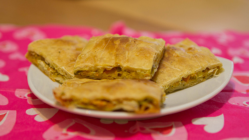 6. وضع الحشو في وسط كل قطعة من العجين ثم قومي بغلقها جيداً وقومي بوضعها في مقلاة بها زيت ساخن حتى تحمر من الوجه وتنضج