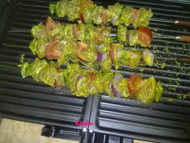 2. وضع الخضروات والدجاج في أسياخ ثم طهي الاسياخ على الشواية لمدة 10 دقائق وتقليبها على كلا الجانبين حتى ينضج الدجاج تماماً ويكتسب لون الشوي